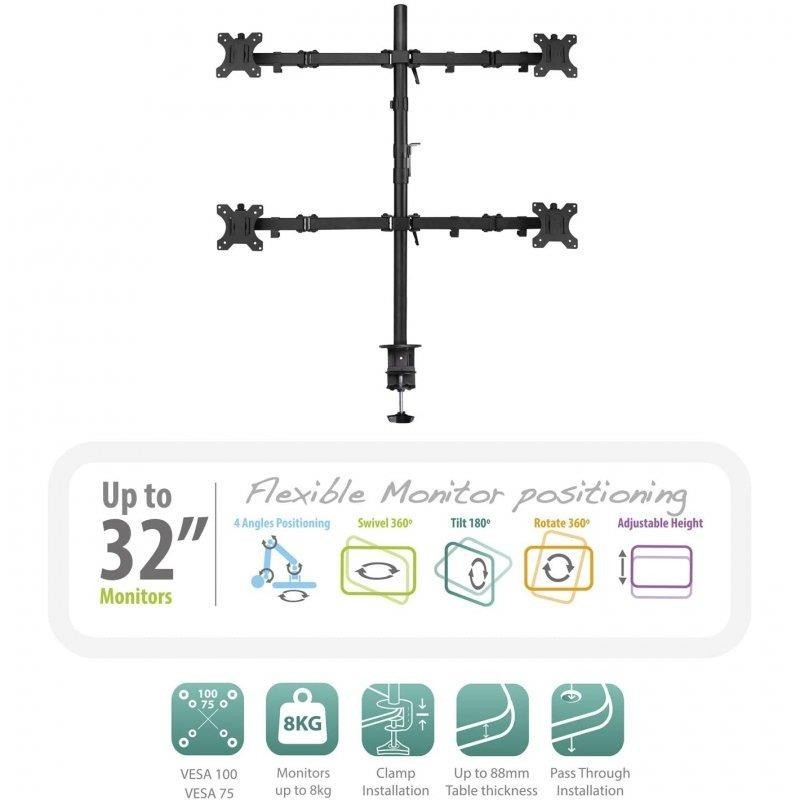 - Soporte de metal para 4 monitores de hasta 32 pulgadas y 8 kg cada uno.