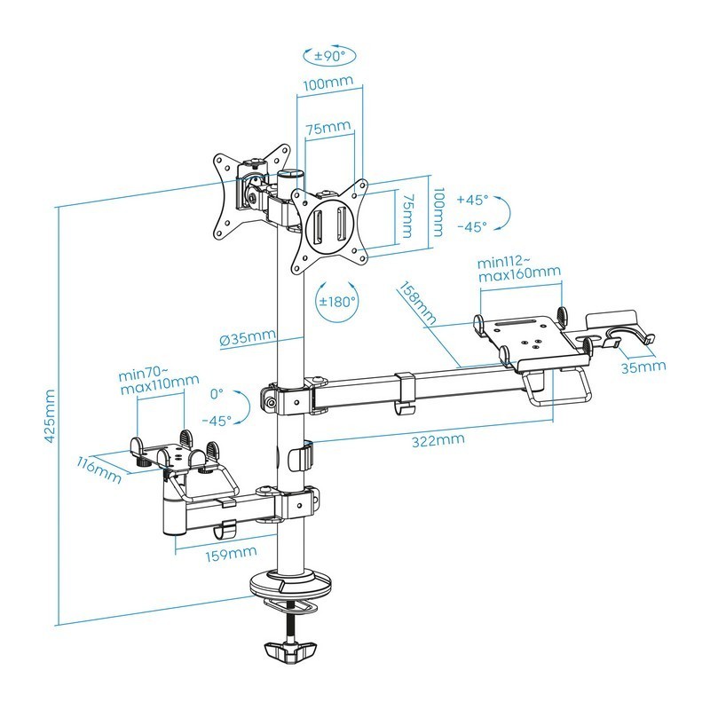 Optimiza tu punto de venta con el Soporte AVPos Multi-Stand, la solución definitiva para organizar tu TPV. Este brazo articulado permite montar dos monitores de hasta 32", una impresora de tickets y un terminal de pago, creando un espacio de trabajo profesional, ergonómico y despejado. Su robusta construcción en metal y sistema de gestión de cables garantizan una instalación limpia y duradera.