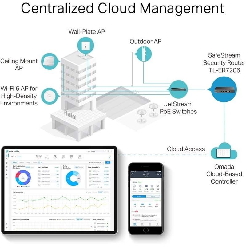 - Integrado en Omada SDN: Zero-Touch Provisioning (ZTP), Administración centralizada en la nube y monitorización inteligente.