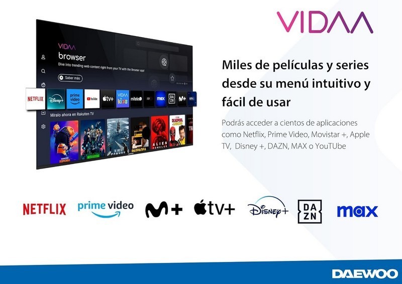 - Sistema Smart TV Vidaa con apps preinstaladas: Netflix, YouTube, Prime Video, Disney+, DAZN, etc.