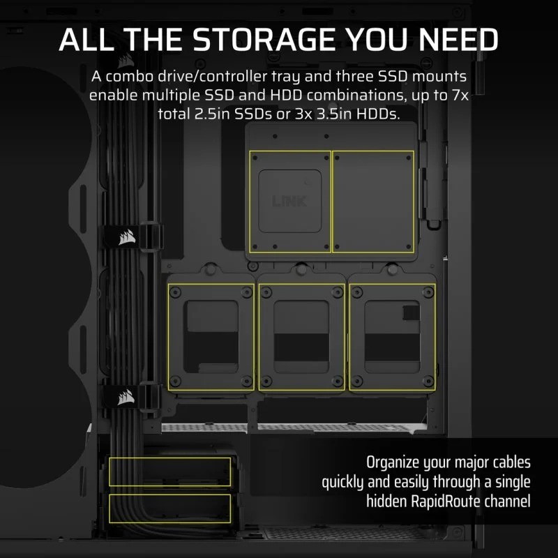 • Sistema de gestión de cables RapidRoute de CORSAIR - Permite enrutar rápidamente tus cables principales a través de un único canal oculto, con un amplio espacio de 30mm detrás de la placa base.