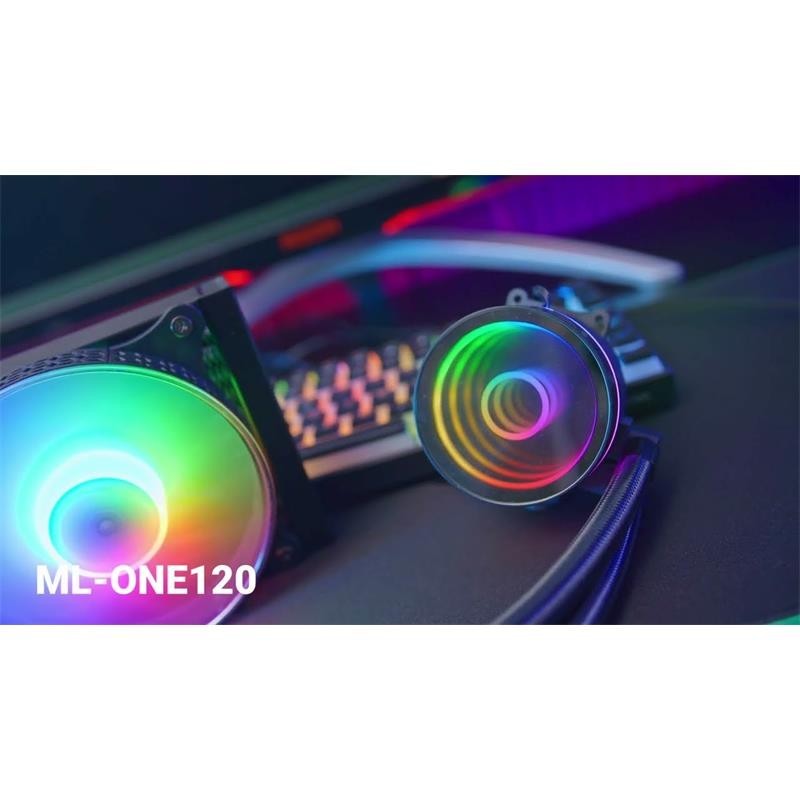 KIT REFRIGERACIÓN LÍQUIDA ML-ONE120. Espejo infinito FRGB y un rendimiento excepcional en sistemas de refrigeración líquida con una extraordinaria potencia de hasta 200W. Nueva bomba OPTI-CHAMBER, ventilador silencioso FDB FRGB, radiador de baja resistencia y compatibilidad universal