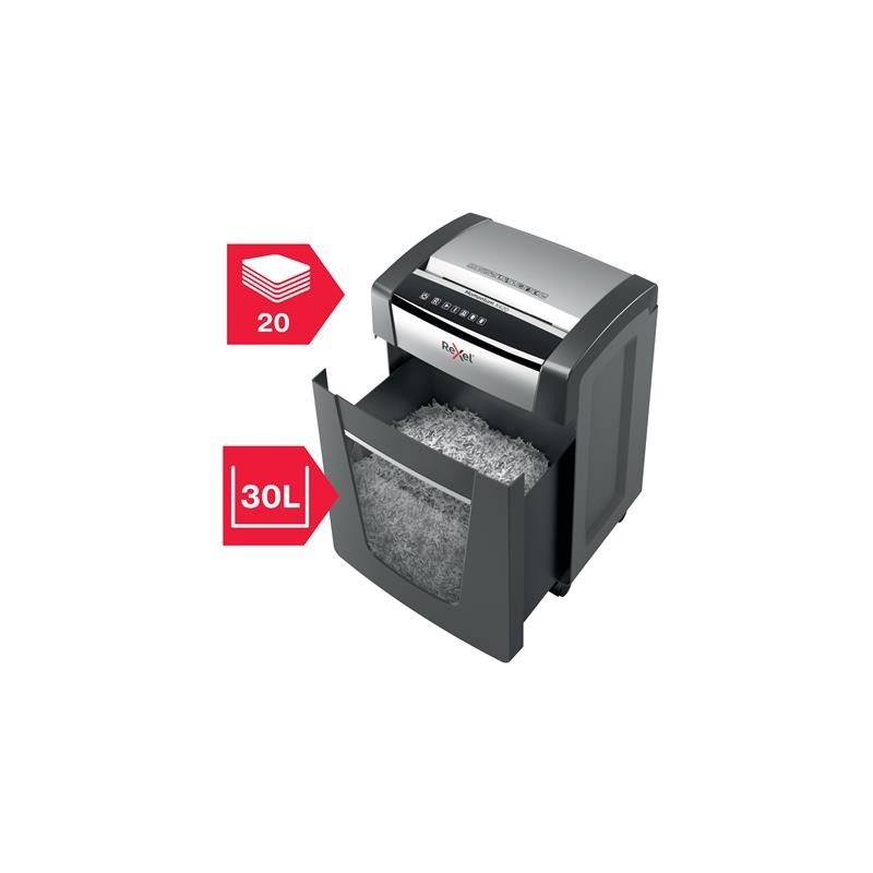 ¡La potencia para destruir más! La destructora de papel Rexel Momentum X420 destruye hasta 20 hojas de una vez, funciona ininterrumpidamente durante 4 horas y es ideal para oficinas pequeñas. La tecnología antiatasco del modelo X420 garantiza el funcionamiento ininterrumpido. P4, corte cruzado (partículas de 4 × 40 mm). Trituradora silenciosa con botones táctiles sencillos e intuitivos y una generosa papelera de 30 litros de capacidad (275 hojas A4).
