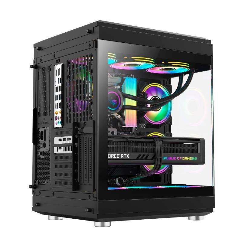 ¡Descubre el PC Gaming Hype, la cima del gaming en blanco y negro! Con diseño panorámico en vidrio templado, tres ventiladores Infinity ARGB Dual-Ring para óptima refrigeración, y capacidad para configuraciones de alta gama. ¡Hazte con lo mejor para tu experiencia gaming!