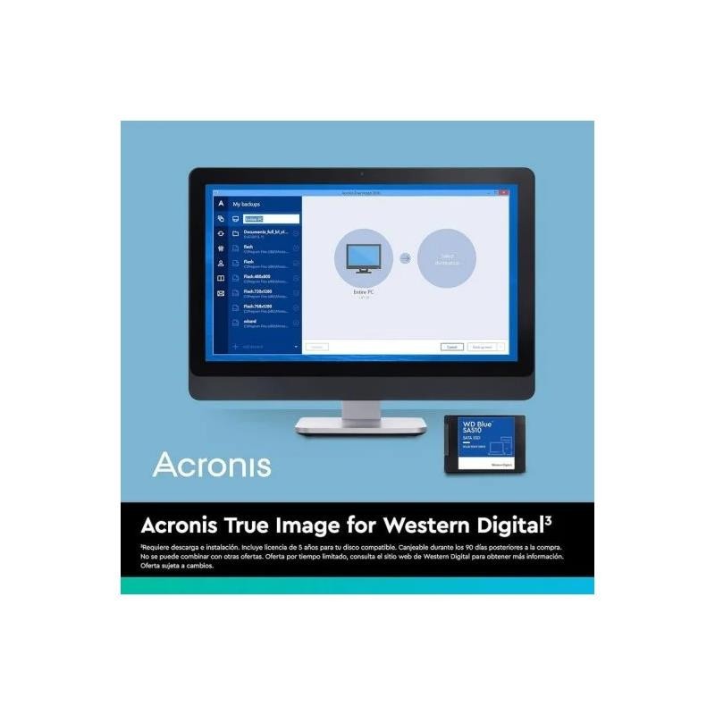 - Potencie su creatividad: Renueve su PC para poder ampliar los límites de su trabajo. Diseñada específicamente para profesionales, creativos, trabajadores independientes, influencers y otros creadores y editores de contenido apasionados, la unidad SSD WD Blue SA510 SATA incorpora el software de copia de seguridad y protección informática Acronis® True Image? for Western Digital.