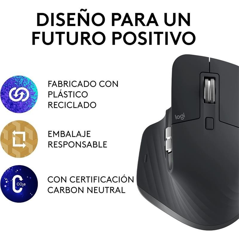 - Las piezas de plástico en MX Master 3S incluyen plástico reciclado posconsumo con certificación (grafito y negro: 27%, gris pálido: 22%(10). Con certificación Carbón Neutral.