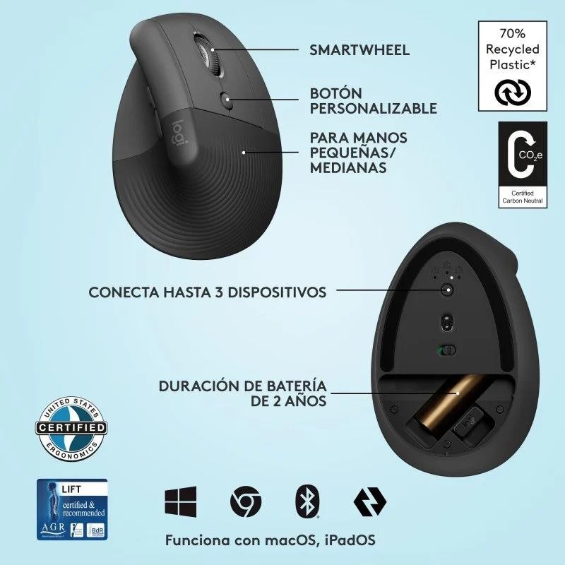 • Certificación Ergo: el ratón vertical inalámbrico Lift fue diseñado, desarrollado, probado y aprobado bajo criterios establecidos por especialistas de la ergonomía.