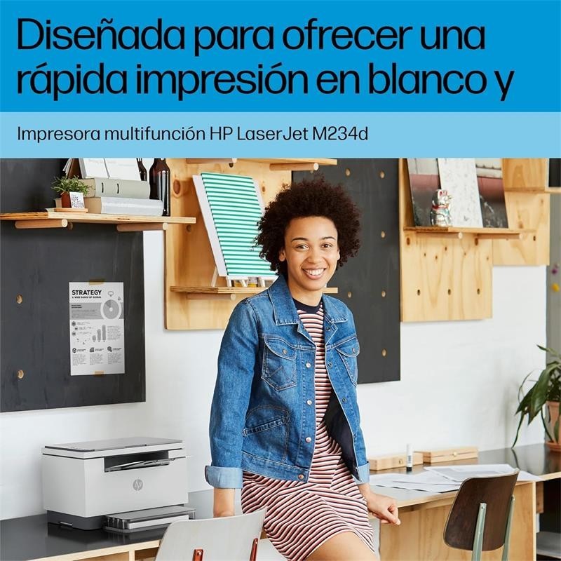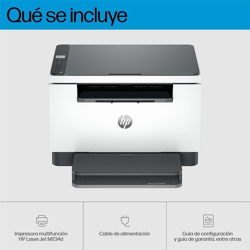 La HP LaserJet MFP M234d es una impresora multifunción láser diseñada para satisfacer las necesidades de pequeñas y medianas empresas que exigen alta productividad y calidad en cada documento. Su diseño compacto y galardonado permite integrarla en cualquier espacio de trabajo, mientras que sus funciones integradas de impresión, copiado y escaneo en blanco y negro la convierten en la solución ideal para oficinas que desean eficiencia y rendimiento.