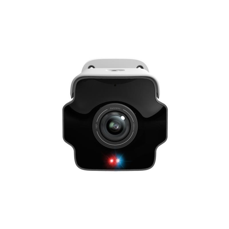 Cámara panorámica 4K de 8MP con visión de 180°, IR de 20 m, luces disuasorias rojas y azules, análisis y clasificación inteligente de personas y vehículos, mejora de vídeo, interfaz de audio y alarma, compresión H.265+, y diseño resistente IP67 e IK10.